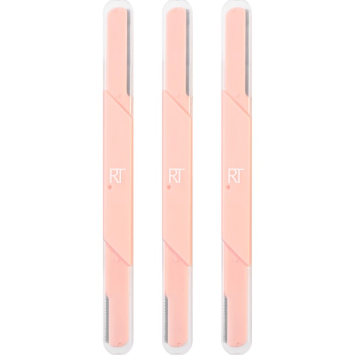 Real Techniques Face & Brow Razors är rakhyvlar för ansikte och bryn. Med dessa hyvlar kan du enkelt ta bort oönskat ansiktshår och döda hudceller för en slät hy, redo för makeup. Dessa rakhyvlar har dubbla ändar: det större bladet är avsett för hela ansiktet och det mindre bladet är avsett för bryndetaljer. 3-pack.
