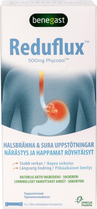 För vuxna och barn över 12 år: 1-2 vätskepåsar efter måltid och vid läggdags, vid symptom. Ta inte fler än 8 vätskepåsar per dygn. Överskrid inte den rekommenderade dygnsdosen. Läs bipacksedeln före användning. Öppna vätskepåsen vid den markerade linjen. Drick upp all vätska i påsen. Reduflux vätskepåsar kan användas under graviditet och amning. Använd inte Reduflux vätskepåsar om du är allergisk mot något något av innehållsämnena. För barn under 12 år rådfråga läkare före användning.