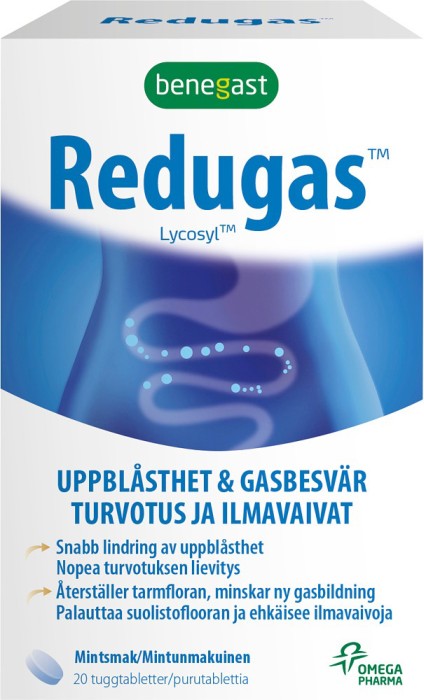För vuxna från 18 år. När symtomen uppträder: 1 tablett efter måltid och före sänggående. Tugga tabletterna noga innan du sväljer dem. Ta inte fler än 4 tabletter per dag. Överskrid inte den rekommenderade dygnsdosen. Använd inte Redugas om du är allergisk mot fruktaner eller är allergisk mot något av innehållsämnena. För gravida, ammande samt barn under 18 år: rådfråga läkare före användning.