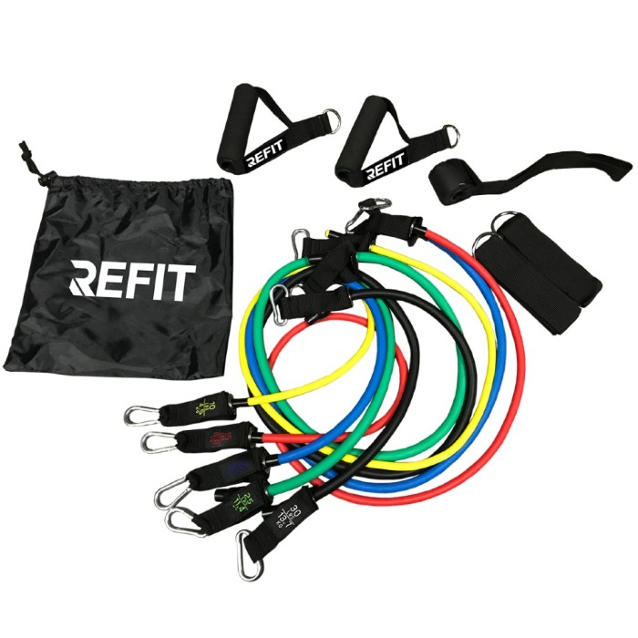 Ett set innehåller 5 exertubes med karbinhake i 5 olika motstånd som kan användas tillsammans i olika variationer, 2 st handtag, 2 st ankelfästen samt ett dörrfäste. Med Refit Multi Tube Set har du nästan som ett komplett minigym hemma.