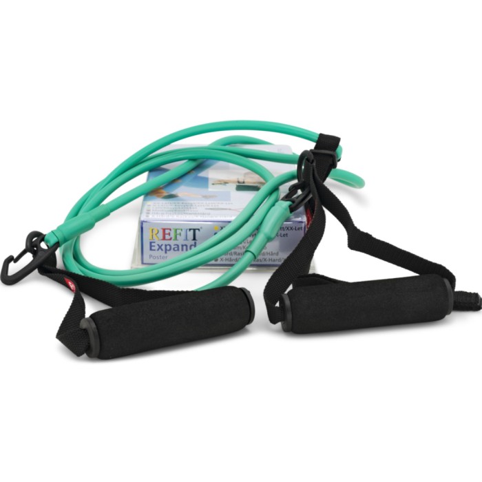 Refit Expander för dig som vill träna hemma. Förpackningen innehåller 2,4 meter tubslang med clips, foamhandtag och dörrfäste.