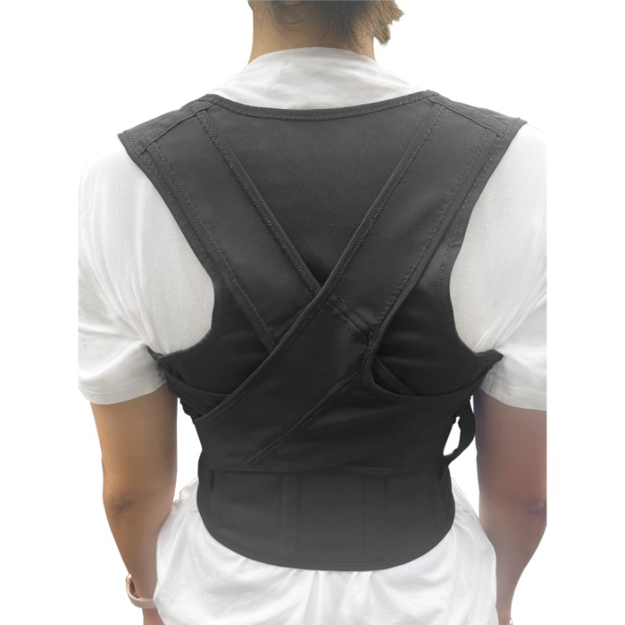 4. Ej FÖR hårt. Västen är till för att ge stöd och att påminna kroppen, genom att det spänner över axlarna, när hållningen försämras. Därför är det viktigt att ha en god hållning när västen sätts på.