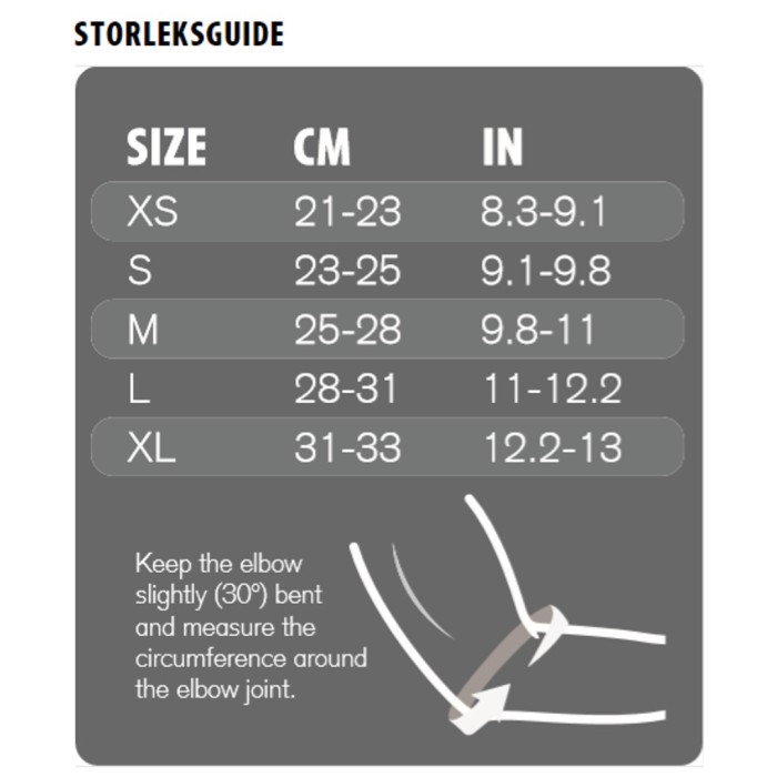Finns i fyra storlekar. (Välj storlek i rullgardinsmenyn ovan.) För att välja rätt storlek, håll armen lätt böjd och mät omkretsen runt armbågsleden.