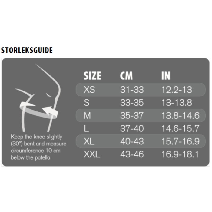 För att välja rätt storlek, håll knäet lätt böjt (30 grader) och mät omkretsen på benet ca 10 cm under knäskålen. SE BILD!