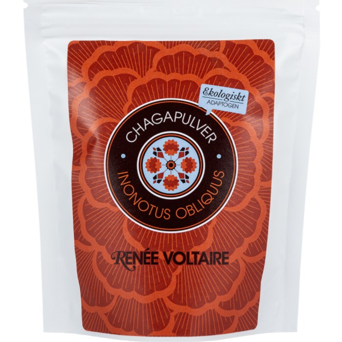 Renée Voltaire Chagapulver Inonotus Obliquus är ett ekologiskt och veganskt mörkbrunt tillskottspulver gjort på den adaptogena svampen sprängtickas (Inonotus obliquus) fruktkropp som växer vilt på björkar i norra Asien. Det finmalda och lättlösliga pulvret är av högsta kvalitet, och utan tillsatser. Har en lång tradition inom den österländska kulturen. Kan användas i gröt, smoothies, yoghurt och bakverk, eller i varm och kall dryck.