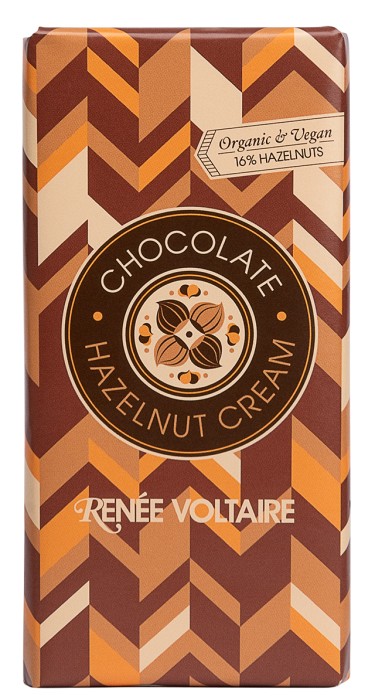 Renée Voltaire Hazelnut Cream är en ekologisk och vegansk chokladkaka med hasselnötskräm. Chokladen har 55% kakaohalt och är gjord på kakaobönor från Nord- och Sydamerika. Chokladen har en fyllning av hasselnötskräm, en kräm som gjorts på noggrant utvalda nötter från Turkiet. Chokladen innehåller 16% hasselnötter.