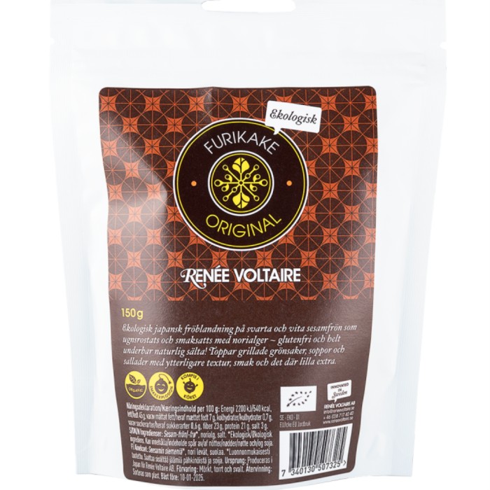 Renée Voltaire Furikake Original är en ekologisk japansk fröblandning utan gluten. En mix av svarta och vita sesamfrön som saltbakats och nori-alg med en god naturlig sälta – färdig att använda. Du kan använda Furikake för att toppa grillade grönsaker, soppor och sallader och ge dem lite ytterligare textur, smak och det där lilla extra. Renée Voltaire Furikake har en smak som är naturligt salt och är god att strö på de flesta maträtter. Ett tips från Renée Voltaires är att prova bitar av färsk lax rullade i furikake och serverade med tamari.