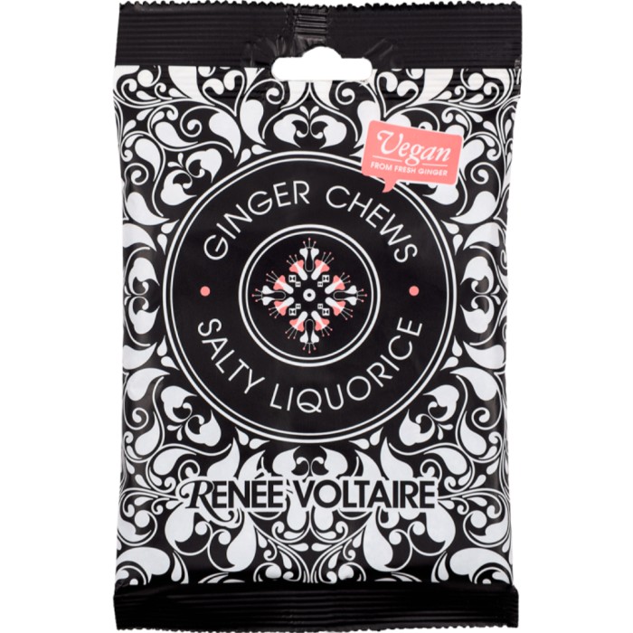 Renée Voltaire Ginger Chews Salty Liquorice är ingefärskolor med saltlakrits. Dessa veganska och glutenfria mjuka kolor är gjorda på färsk ingefära som smaksatts med salmiak och lakritsrot – en smakkombination där den salta lakritsen förstärker den kraftfulla ingefärssmaken.