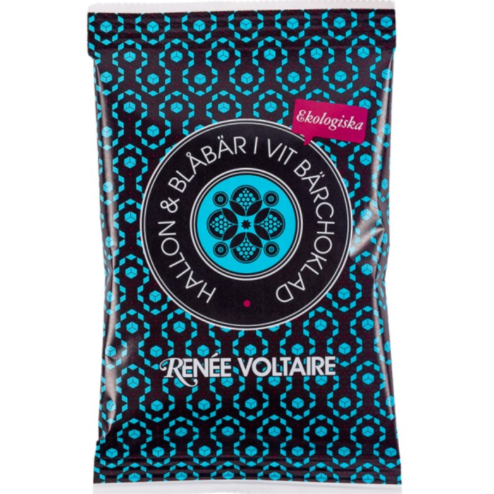 Renée Voltaires ekologiska torkade hallon och blåbär doppade i bärsmakande vit choklad. Detta är en oemotståndligt sötsyrlig smakkombination, en påse godsaker som är goda att äta som de är, eller använda för att toppa en dessert för att ge den en extra lyxig touch.
