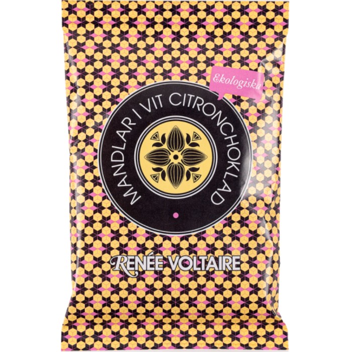 Renée Voltaire Mandlar i vit citronchoklad är en liten påse godsaker i form av ekologiska mandlar som doppats i vit citronchoklad och rullats i torkade rosenblad. Detta är en sötsyrlig smakkombination som kan ätas som de är, eller använda för att toppa en dessert för att ge den en extra lyxig touch.