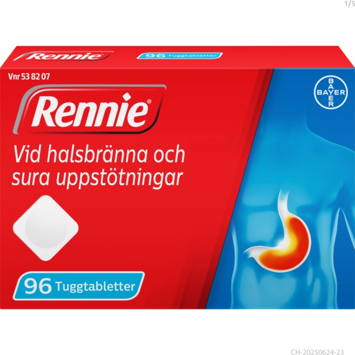 Rennie tuggtabletter är ett receptfritt läkemedel som ger lindring vid halsbränna och sura uppstötningar, samt syrarelaterad smärta i maggropen. Rennie binder överskott av saltsyra i magen. Den syrabindande effekten kommer inom några minuter. En tablett binder ca 15,2 mmol saltsyra. Tabletterna har en smak av pepparmint.