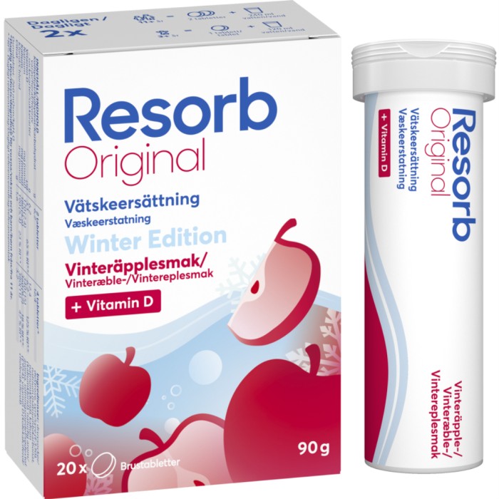 Resorb® Orginal Winter Edition med smak av vinteräpple är en frisk och välbalanserad smak som passar för aktiva vinterdagar. Resorb® Original är vätskeersättning i form av brustabletter som används för att tillföra kroppen vätska och salter. Resorb Vinteräpple innehåller D-vitamin som bidrar till immunsystemets normala funktion. För vuxna och barn från 3 år.