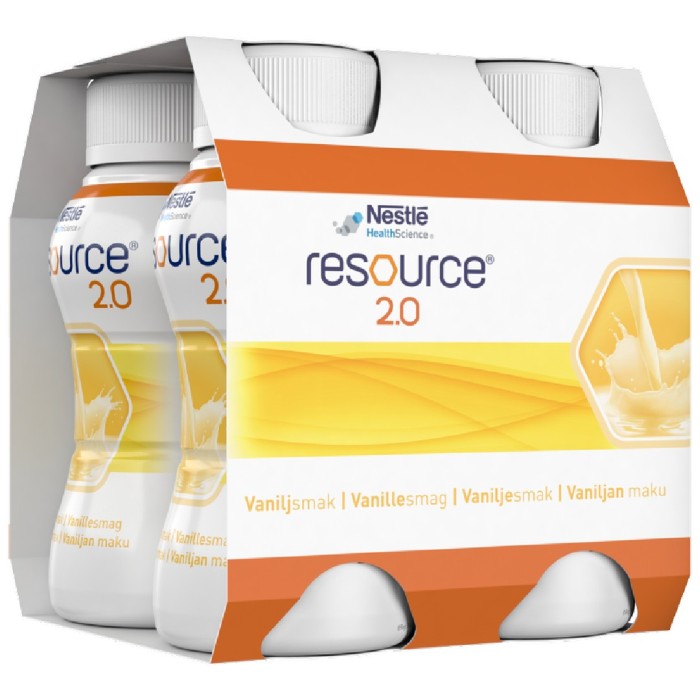 Resource® 2.0 är en näringsmässigt komplett näringsdryck med högt energiinnehåll, utan fiber. Resource® 2.0 är avsedd för kostbehandling av patienter vid malnutrition eller vid risk för malnutrition. Även lämplig vid t.ex. Crohns sjukdom. Ett bra val för undernärda patienter som har svårt att äta och dricka stora volymer, t.ex. vid cancer, KOL, geriatriska nutritionsproblem eller hjärtsvikt . Intas lämpligen som mellanmål och gärna fördelat i små portioner under dagen. Drycken kan även användas i samband med vätskerestriktion