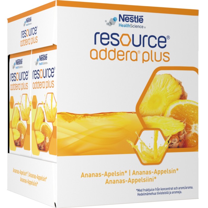 Resource Addera Plus är en klar, fruktig och energirik näringsdryck som kan hjälpa personer med (risk för) undernäring att få i sig extra energi och näring. Kan användas till personer med njursvikt och vid fettmalabsorption. Näringsdrycken innehåller fruktjuice, vilket ger en frisk och god smak. Resource Addera Plus finns i 6 olika smaker. Denna dryck har en smak av ananas & apelsin.