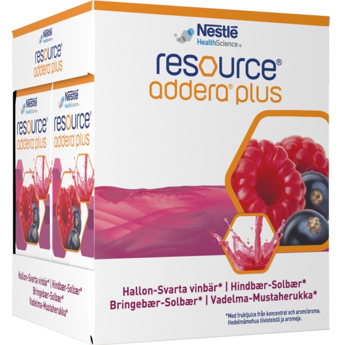 Resource Addera Plus är en klar, fruktig och energirik näringsdryck som kan hjälpa personer med (risk för) undernäring att få i sig extra energi och näring. Kan användas till personer med njursvikt och vid fettmalabsorption. Näringsdrycken innehåller fruktjuice, vilket ger en frisk och god smak. Resource Addera Plus finns i 6 olika smaker. Denna dryck har en smak av hallon & svarta vinbär.