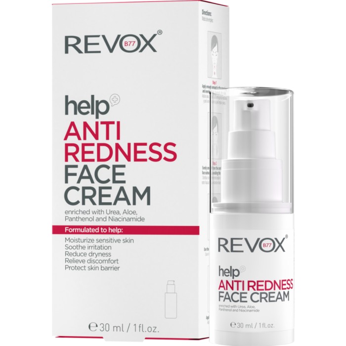 Revox B77 Help Anti Redness Face Cream är en ansiktskräm med aloe som motverkar uttorkning av huden. Krämen har en formulering som passar för känslig hud. Motverkar torrhet, obehag och en försvagad hudbarriär som kan orsakas av regelbunden överdriven exfoliering eller andra faktorer.