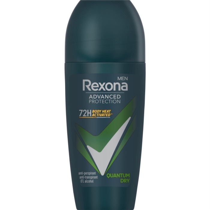 Rexona Advanced Protection Quantum Dry Antiperspirant är en deodorant roll-on för män. Deodoranten har en energigivande doft och hjälper dig att känna dig ren och fräsch under dagen. Rexona Quantum Dry är en roll-on-deodorant som ger dig upp till 72 timmars effektivt skydd mot svett och lukt, Tack vare Body Heat Activated-tekniken ger Rexona Quantum Dry en fräschör som varar timme efter timme. Ju mer du rör dig, desto mer skyddar Rexona deodorant tack vare sin unika teknik.