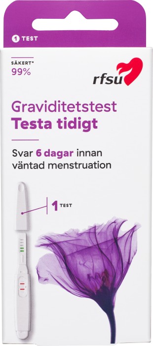 Så här gör du testet Du kan testa när som helst under dygnet redan 6 dagar innan utebliven menstruation, men säkrast är att mäta morgonurinen, då hCG-koncentrationen är som högst. 1a. Testa direkt i urinstrålen. Håll teststickan med uppsugningsdelen riktad neråt i urinstrålen i 10 sekunder. Se till att det inte kommer urin på resultatfönstret. 1b. Eller samla urin i en ren och torr behållare, ett par centimeter från botten räcker. Doppa ner hela uppsugningsdelen i urinen i 20 sekunder. 2. Sätt tillbaka skyddshylsan och lägg teststickan på en plan och torr yta med resultatfönstret uppåt. När teststickan börjar reagera färgas resultatfönstret ljust rosa. Vänta i 1-5 minuter innan du läser av resultatet och låt teststickan ligga helt still. 3. Ett eller två rosa/röda linjer visas mot ljus bakgrund i resultatfönstret, den ena linjen för kontroll och andra linjen för testresultat. Läs inte av några resultat efter 5 minuter då detta kan ge missvisande resultat. Så här läser du av resultatet Positivt resultat – du är gravid Om två tydliga rosa/röda linjer visas så är du sannolikt gravid. Färgnyansen och färgstyrkan på testlinjen kan variera eftersom olika stadier av graviditet har olika koncentrationer av hCG-hormon. Om du är osäker är det bra att testa på nytt efter 2 dagar, helst med den första morgonurinen. Om du är gravid, kontakta läkare, barnmorska eller gynekolog för rådgivning. Negativt resultat – du är inte gravid Om endast en färgad linje visas så är du inte gravid. Om du ändå inte får din menstruation, gör ett nytt test efter 2 dagar, helst med den första morgonurinen. Får du samma resultat och inte fått din menstruation kontakta läkare, barnmorska eller gynekolog. Ogiltigt resultat Om ingen linje visas, gör ett nytt test och följ noga användaranvisningen. Det kan bero på att du inte har utfört testet på rätt sätt. Om problemet kvarstår kontakta RFSU.