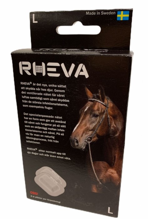 Rheva Large är ett formgjutet sårskydd/plåster för hästar. Plåstret är tillverkat av medicinskt klassad plast med en perforerad utbuktning mitt på. Används för att skydda från infektionsrisker som smuts och insekter och med en utbuktning som gör att det blir en luftficka ovanför såret. Detta ger en fuktig miljö där syre släpps in. En viss fuktighetsgrad ger en gynnsam läkningsmiljö. Med Rheva sårskydd ger du din häst en chans att läka naturligt under skonsamma förhållanden samtidigt som man minskar behovet av antibiotika. Det är viktigt med noggrann rengöring av pälsen inför användning av Rheva.