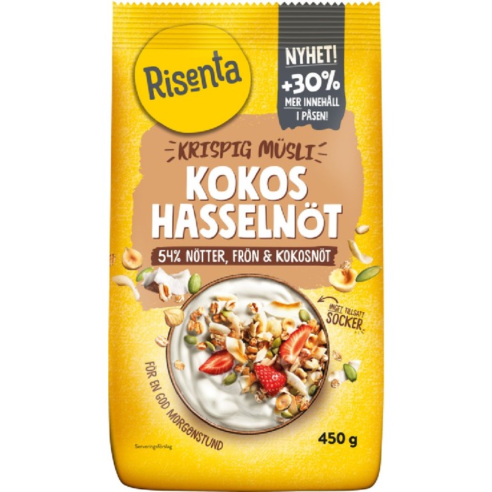 Risenta Krispig Müsli med Kokos & Hasselnöt är en müsli med goda ingredienser och med smaker som kanske piggar upp morgonen. Müslin innehåller inte något tillsatt socker.