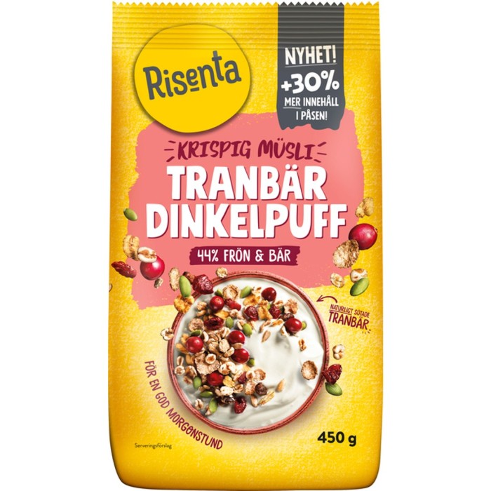 Risenta Krispig Müsli med tranbär och dinkelpuffar är en müsli med utan tillsatt socker. God till frukost eller till ett mellanmål.