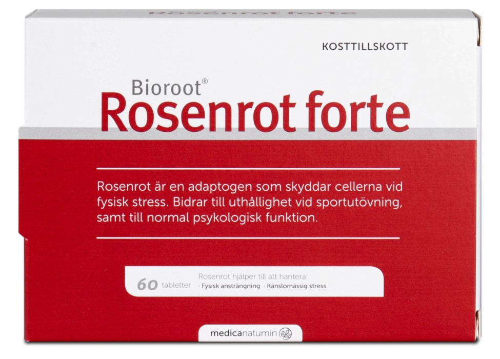 Rosenrot forte innehåller standardiserat, högkoncentrat extrakt av rosenrot (Rhodiola rosea L.), samt det patenterade svartpepparextraktet Bioperine® (Piper nigrum L.). Rosenrot är en adaptogen. Rosenrot forte innehåller dessutom extrakt av svartpeppar.