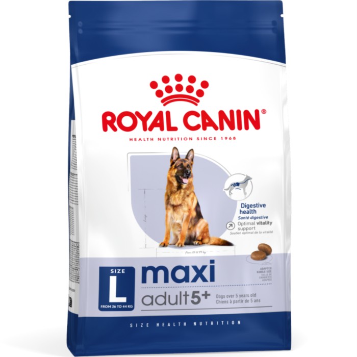ROYAL CANIN® Maxi Adult 5+ är för hundar över 5 års ålder. Det är ett näringsriktigt och balanserat helfoder som är speciellt utformat för att uppfylla din stora hunds särskilda behov och som stöd i takt med att hunden blir äldre.