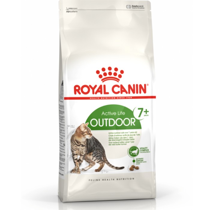Om din aktiva, vuxna katt tillbringar mycket tid utomhus är det viktigt att utfodra den med en kost som ger det näringsstöd som behövs för att bibehålla optimal hälsa. ROYAL CANIN® Outdoor 7+ torrfoder är speciellt utvecklat för hela näringsbehovet hos äldre utekatter som din. Det är avsett för aktiva utekatter som är 7 år eller äldre och innehåller ett exklusivt vitalitetskomplex som hjälper din katt att möta de första tecknen på åldrande. Fodret är berikat med riktade näringsämnen som polyfenoler från grönt te, C-vitamin, EPA och DHA. Omega-3-fettsyror som EPA och DHA bidrar till att stödja ledhälsa när din katt åldras.