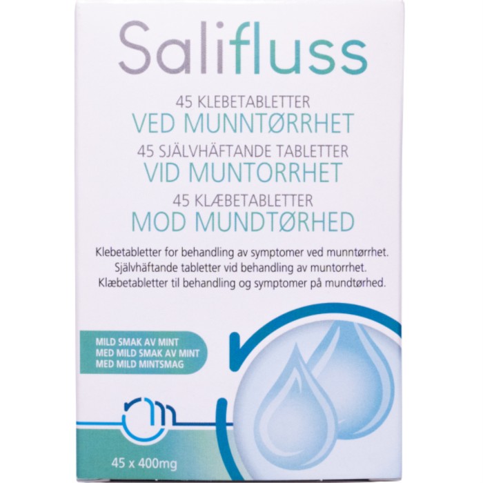 Salifluss är en självhäftande tablett som kan användas vid muntorrhet (xerostomi). Salifluss stimulerar salivproduktionen och förebygger på så sätt tanderosion och karies.