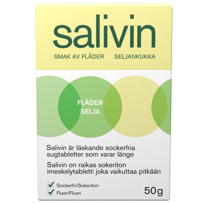Salivin sugtabletter Nordic Fresh har en smak av fläder och kan tas vid muntorrhet. De läskande sugabletterna är sockerfria och innehåller fluor. Tabletterna stimulerar salivproduktionen samtidigt som de är skonsamma för tänderna. Kan tas av vuxna och barn från 12 år.