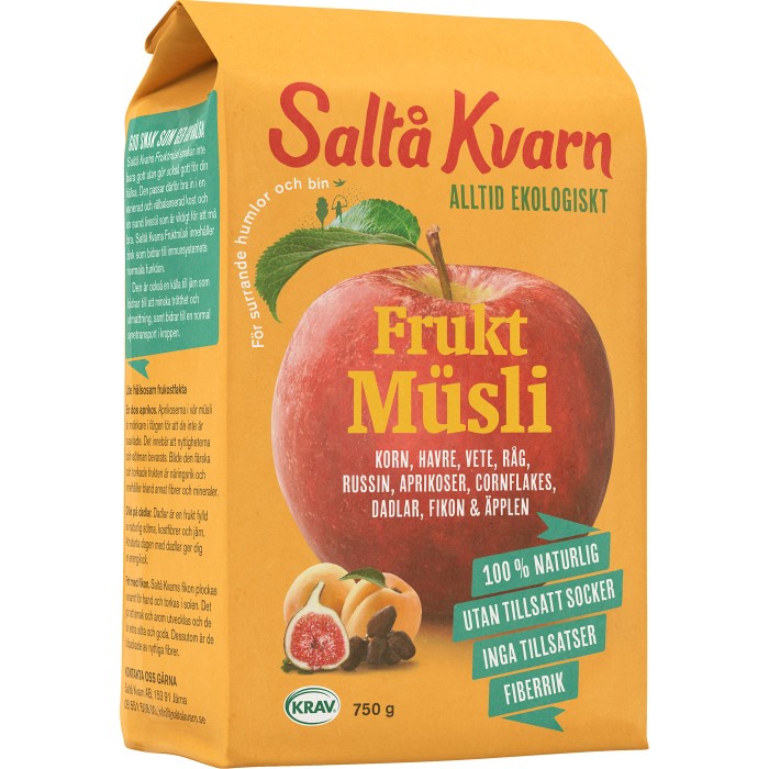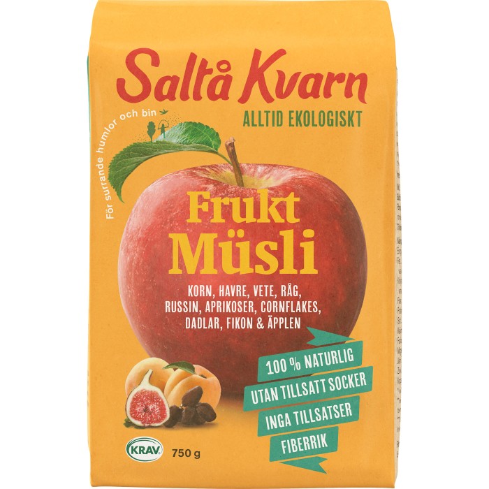 Saltå Kvarns Fruktmüsli innehåller, precis som namnet avslöjar, extra mycket frukt. Den söta smaken i müslin kommer från russin, aprikoser, fikon, dadlar och äpplen. Dessutom innehåller Saltå Kvarns Fruktmüsli fullkornsflingor av korn, havre, vete och råg. Både grodd och kli finns kvar vilket.