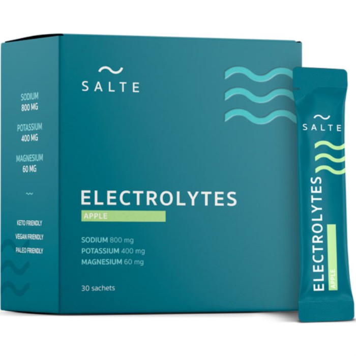 SALTE Electrolytes Äpple är ett kosttillskott som kombinerar elektrolyter, där en dospåse innehåller 800 mg natrium, 400 mg kalium och 60 mg magnesium. SALTE Elektrolyter är framtagen för personer med en aktiv livsstil. Kan intas före eller efter träning, eller under varma sommardagar när man svettas mycket. Magnesium bidrar till normal muskelfunktion och bidrar till normal energiomsättning. Magnesium bidrar även till elektrolytbalansen och bidrar till att minska trötthet och utmattning. Förpackad i smidiga dospåsar. Äppelsmak. 30 st. Innehåller sötningsmedel.