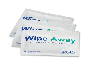 Salts WipeAway våtservett används för att ta bort eventuella häftrester vid byte av stomibandage.