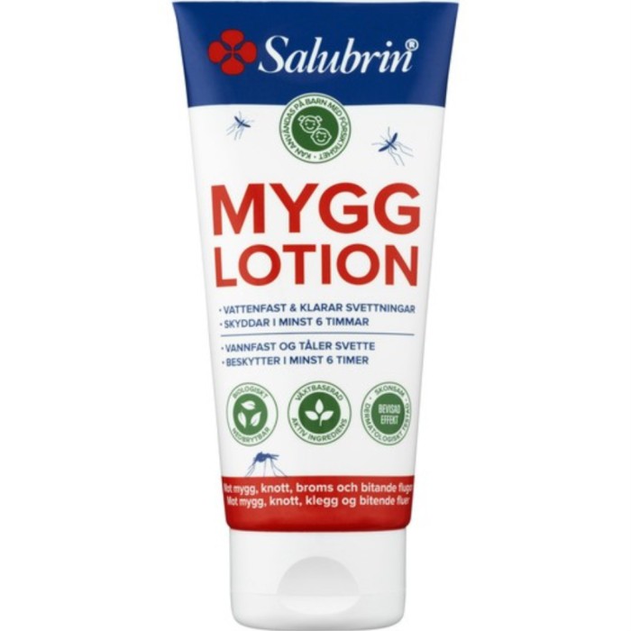 Salubrin Mygglotion skyddar mot bett från mygg, knott och bitande flugor. Mygglotionen är effektiv och skyddar i minst 6 timmar. Har även effekt mot bin och hästflugor. Godkänd för användning på barn under 3 år. Vattenfast för att klara svettningar och bad. Dermatologiskt testad.