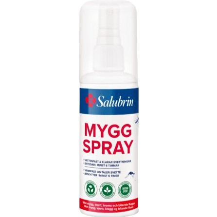 Salubrin Myggspray skyddar effektivt mot bett från mygg, knott och bitande flugor. Myggsprayen ger skydd i minst 6 timmar och har även effekt mot bin och hästflugor. Vattenfast och klarar svettningar och bad. Godkänd att användas på barn under 3 år.