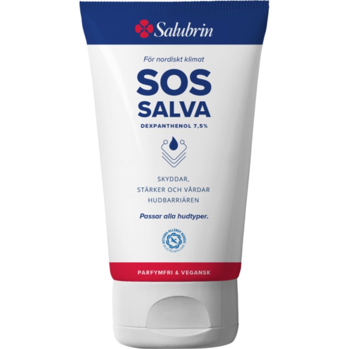 Salubrin SOS Salva är en skyddande och vårdande salva med 7,5% dexpanthenol som kan användas till torra hudområden på hela kroppen. Salvan är utvecklad för att vårda torr hud och kan användas på narig hud och på små hudsprickor. Salvan har en förmåga att binda fukt till huden så att huden inte torkar ut.
