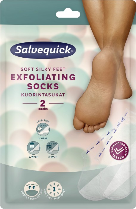 Salvequick Exfoliating Sock är en fotvårdsstrumpa som tar bort död hud, förhårdnader och sprickor på fötterna med en enda behandling. Strumpan innehåller ingredienser som har en peelingeffekt på det yttersta lagret av huden på fötterna och gör fötterna mjukare.