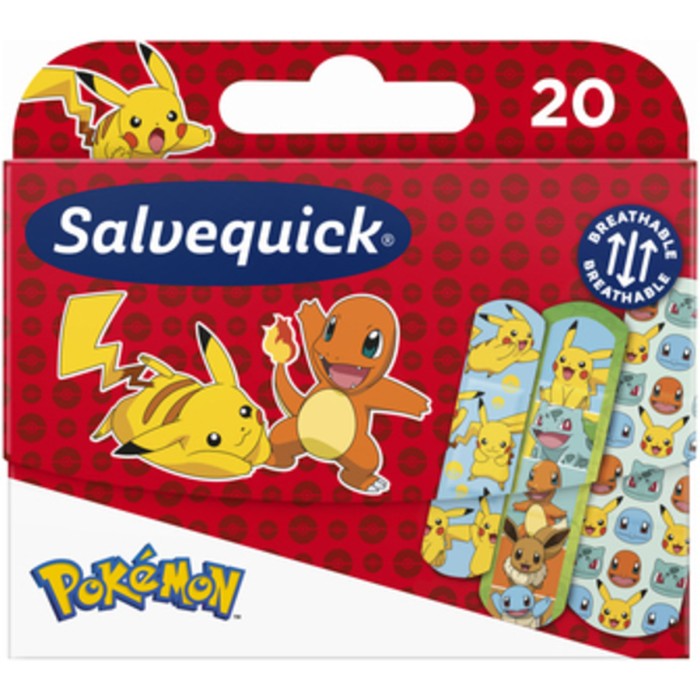 Salvequick Pokémon är ett följsamt och tåligt plåster för barn. Plåstren har roliga Pokémon-figurer för att kanske göra sårläkningen lite roligare. Salvequicks plåster låter huden andas och är vatten- och smutsavvisande. Salvequicks barnplåster har skonsamt lim för barns känsliga hud.