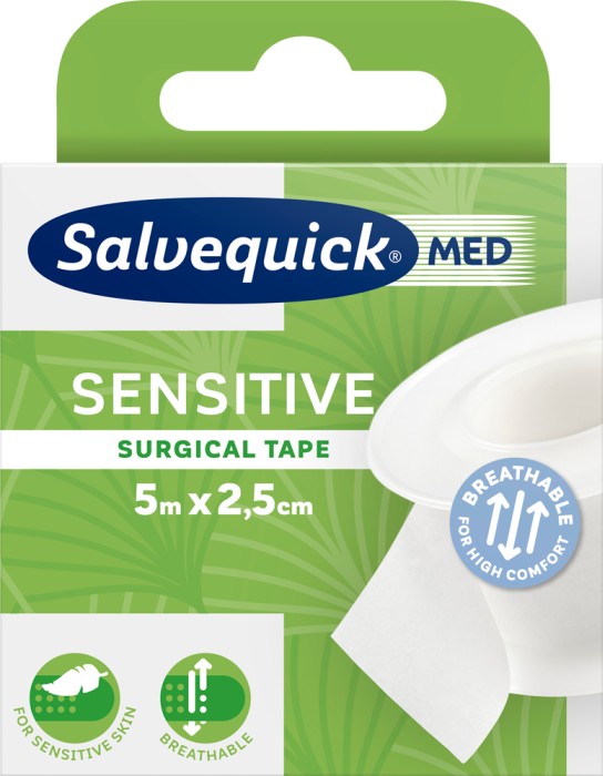 Salvequick Surgical Tape är en tunn kirurgtape med skonsam häftmassa för känslig hud. Kirurgtape används för fixering av kompresser och bandage.