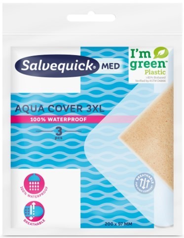 SalvequickMED Aqua Cover 3XL är ett extra stort, vattentätt och tunt snabbförband som låter huden andas. Aqua Cover hjälper till att påskynda sårläkningen och minskar risken för ärrbildning. Plåstret sitter säkert med lim runt alla sidor. Används för större sår t ex operationssår och skrubbsår. Ta bort den översta skyddsfilmen (blå flik) efter applicering.