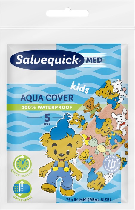 SalvequickMED Aqua Cover Kids är ett vattentätt snabbförband med kompress och självhäftande skyddsfilm i praktiskt, stort format som tål tuffa tag.