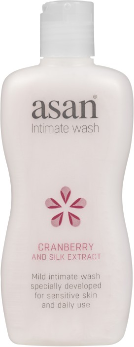 Asan mild intimtvätt tranbär är en mild intimtvål med pH-värde kring 5 och mjölksyra som upprätthåller balansen i underlivet. Asan intimtvätt innehåller tranbär- och silkesextrakt. Har en krämig konsistens och en mild doft.
