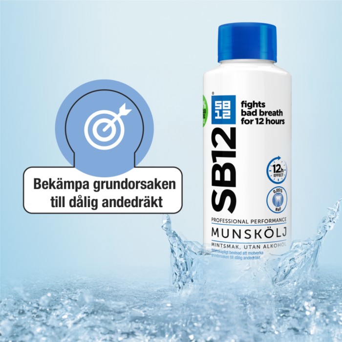 SB12 Original är en patenterad, dubbelverkande munskölj som både neutraliserar dålig andedräkt och stärker dina tänder. Detta munskölj från SB12 har en unik sammansättning av zink och klorhexidin som reducerar och förhindrar uppkomsten av de ämnen som ger dålig andedräkt. Skölj med 10ml i ca ½-1 minut morgon eller kväll för god andedräkt. För 24 timmarseffekt, skölj morgon och kväll.