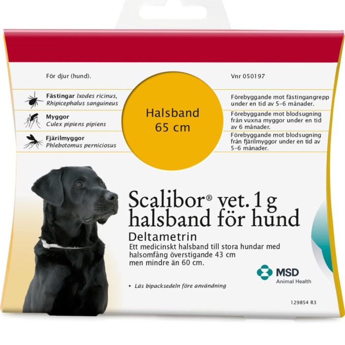Till hund. Scalibor® vet. är ett halsband som skyddar hunden mot fästingar och myggor i 5-6 månader. Full effekt uppnås efter en vecka. Hunden ska dock inte bada under de första 5 dagarna.