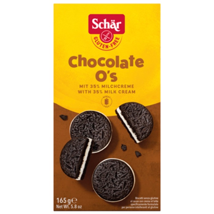 Schär Chocolate O’s är glutenfria och krispiga chokladkakor med 35% mjölkkrämfyllning. Goda att ha med på utflykten eller på fikapausen. Innehåller fibrer.