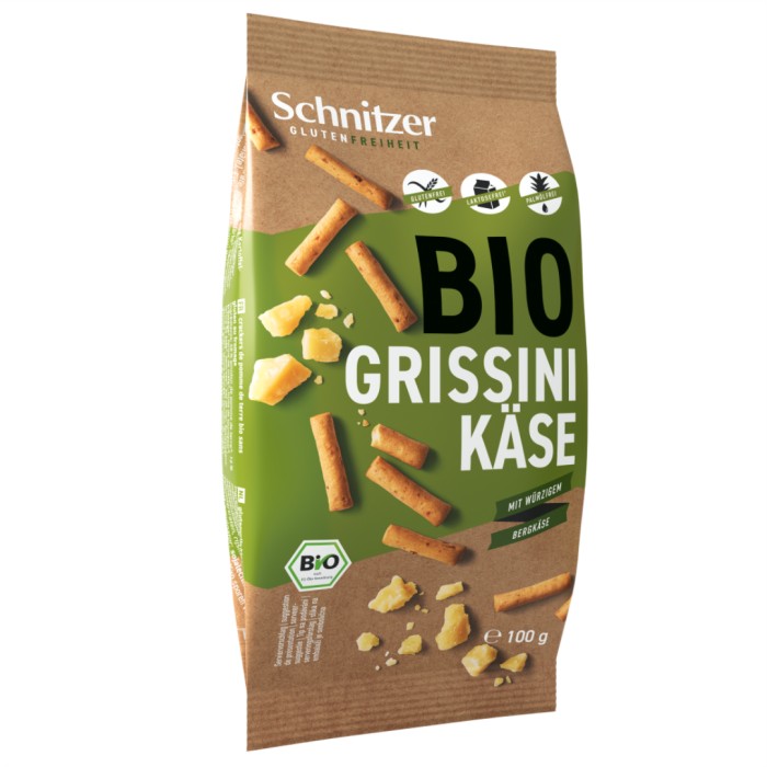 Schnitzer Glutenfri Grissini Ost är den glutenfria tolkningen av det traditionella italienska mellanmålet, här med smak av fjällost. Små, krispiga tuggor fria från gluten, vete, palmolja och laktos. Klara att ätas. Vegansk. Ekologiskt certifierad med EU-lövet.