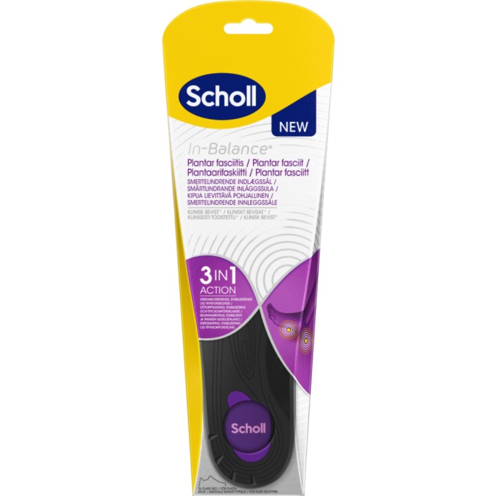 Scholl Med Insoles Plantar Fasciitis är en dämpande iläggssula som kan användas vid plantar fasciit, och har en 3-i-1-effekt. Innersulan absorberar stötar som orsakas av belastning för att lindra smärta vid plantar fasciit. Sulan fördelar din vikt jämnare för att ge tryckavlastning, och den bidrar till att stabilisera foten.