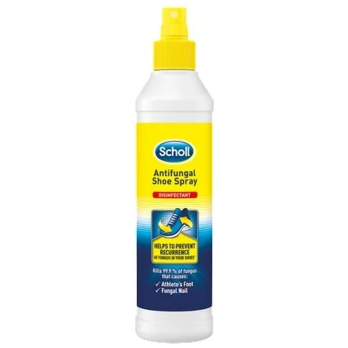 Scholl Antifungal Shoe Spray är en svampdödande skospray, en spray som är som ett desinfektionsmedel för insidan av dina skor. Scholls skospray är en effektiv spray som dödar 99,9% av all svamp som orsakar fotsvamp och nagelsvamp. Sprayen kan användas som komplement till fot- och nagelsvampsbehandlingar för att förhindra återinfektion då bakterier och svampsporer överlever länge i skorna.