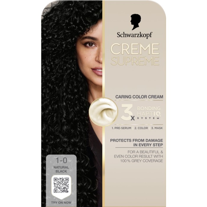 Schwarzkopf Creme Supreme 1-0 Natural Black är en vårdande hårfärg med ett 3x bonding HaptIQ System som förbereder, skyddar och stärker håret för ett fint och jämnt färgresultat med 100% gråhårstäckning.