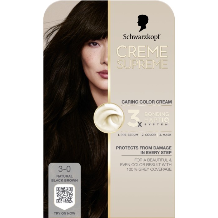 Schwarzkopf Creme Supreme 3-0 Natural Black Brown är en vårdande hårfärg med ett 3x bonding HaptIQ System som förbereder, skyddar och stärker håret för ett vackert och jämnt färgresultat med 100% gråhårstäckning.